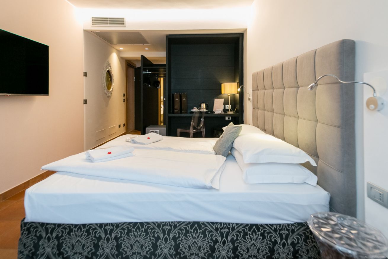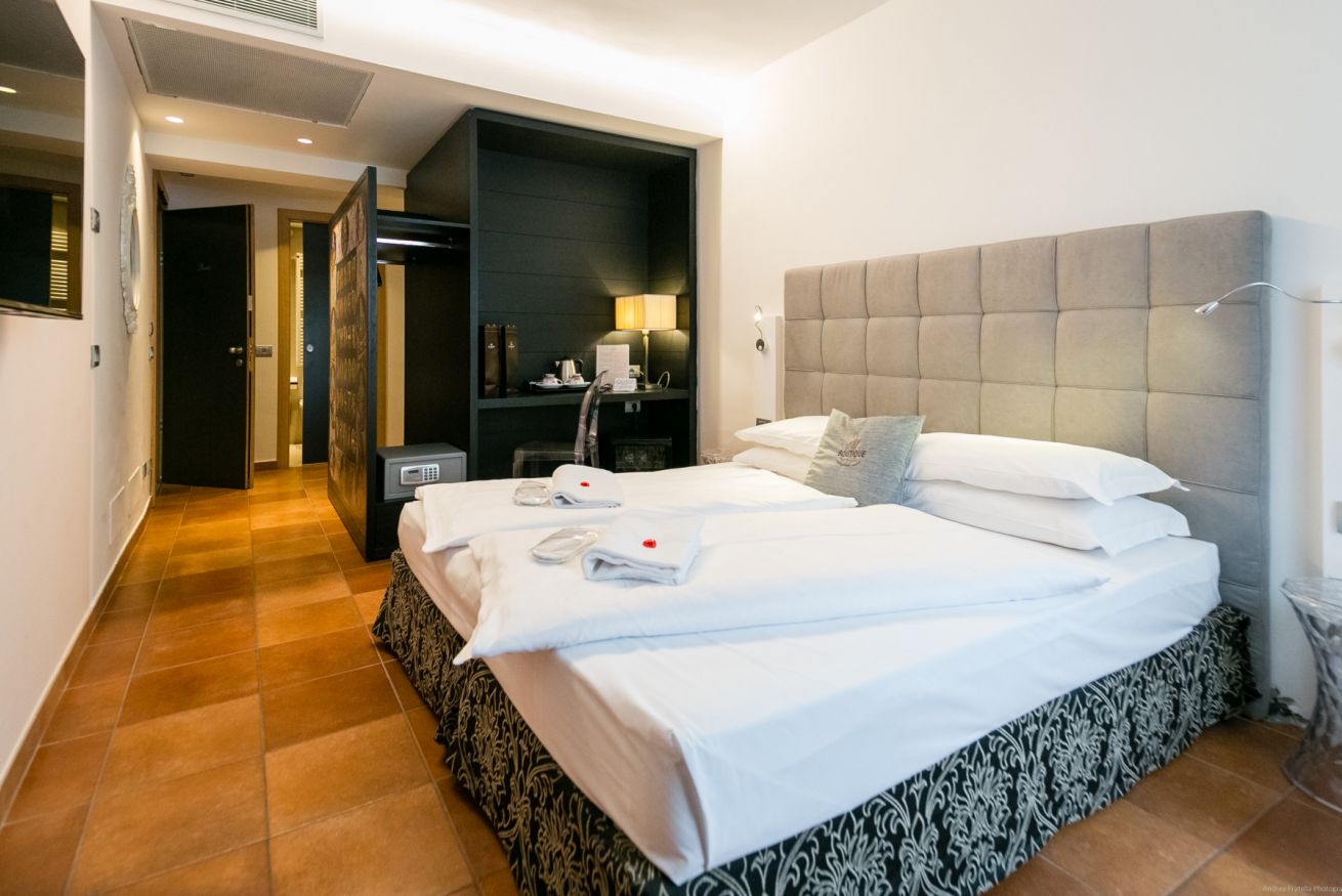 Troverete in camera: bagno in stanza con WC separato, cabina sauna infrarossi, doccia multifunzione, asciugacapelli, TV lcd-smart, Internet Wi-Fi, cassetta di sicurezza, frigobar. Letto matrimoniale di cm 180 (due sommier uniti) oppure due letti singoli di cm 90. Possibilità di letto aggiunto e/o culla (a pagamento).